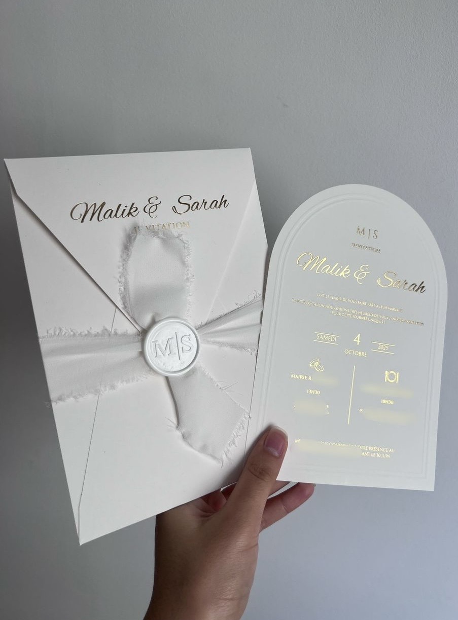 Avec son haut en forme d’arche et ses lignes droites à la base, ce faire-part marie harmonieusement courbes et structure.